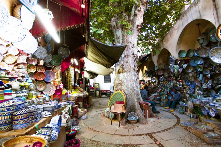 A meeting of the object, but more of the human, exploring this route you will come into contact with these men working every day to create the thousand and one objects encountered at the turn of streets of the medina. Beyond mere ornament, each piece falls from a tradition and know-how from a long learning and meticulous work. Of great diversity, Fassi handicrafts will be unveiled by small touches: leather work through the textile or visit the built heritage, will allow you to identify some of its wealth. Go to encounter such an atypical profession, working in the Horn of Mechatine street or even the work horse saddles Seqqatine the street. Marvel also face the fine embroidery and delicate silks of Qissariat, large shopping hall dedicated to textiles. Witness the flourishing business of the medina of Fez, the fondouks Qaât Smen Tazi and you will be presented during this route, as well as the souk El henna, where one can observe blue faience pottery, handicrafts emblematic of Region of Fez.